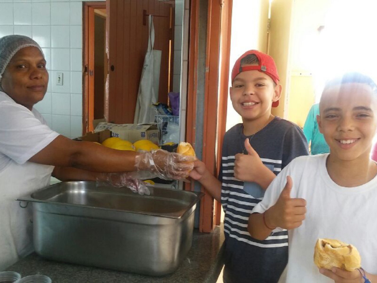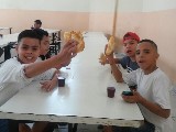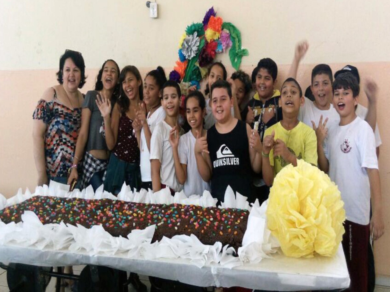 A escola ofereceu às crianças um delicioso lanche e um grande bolo