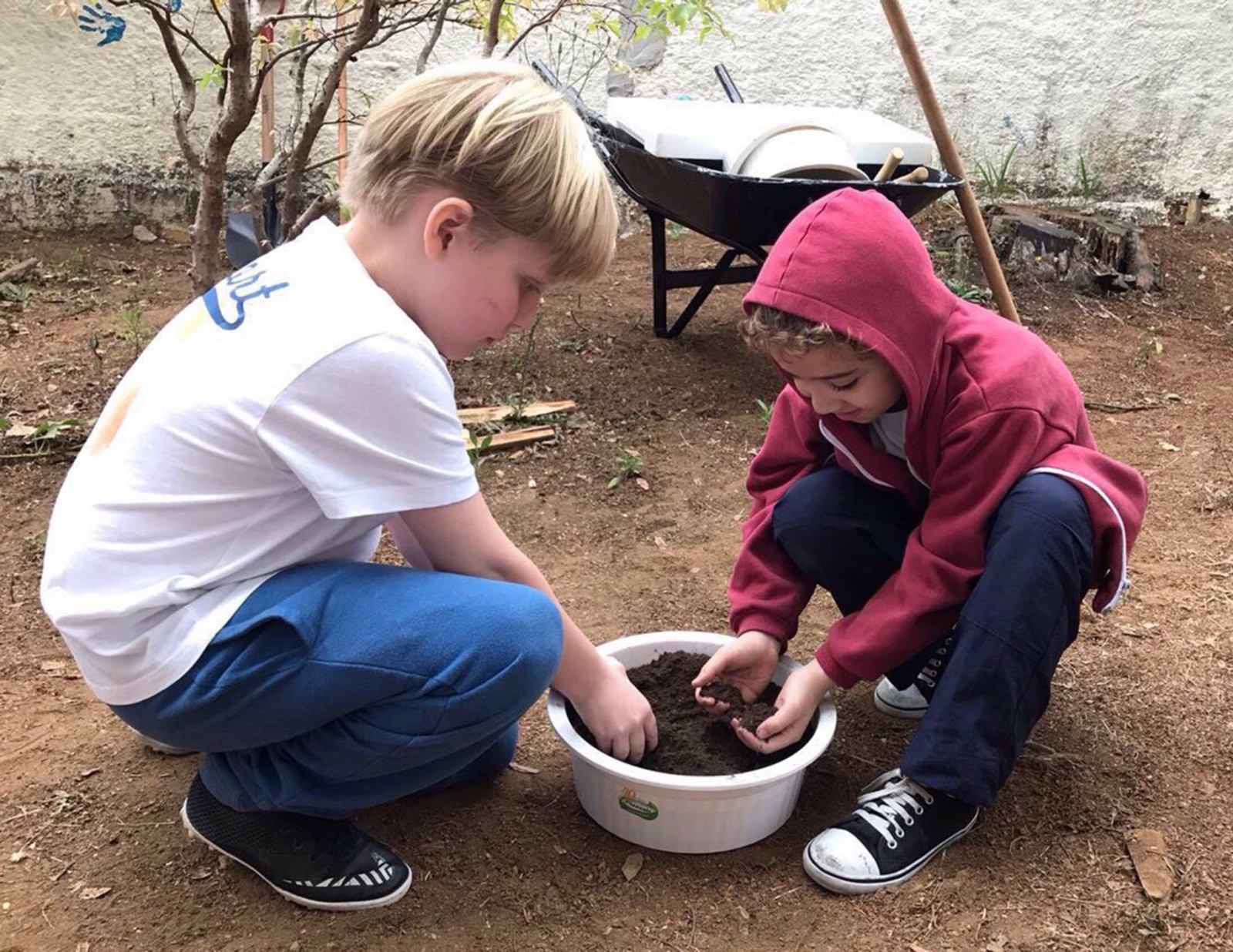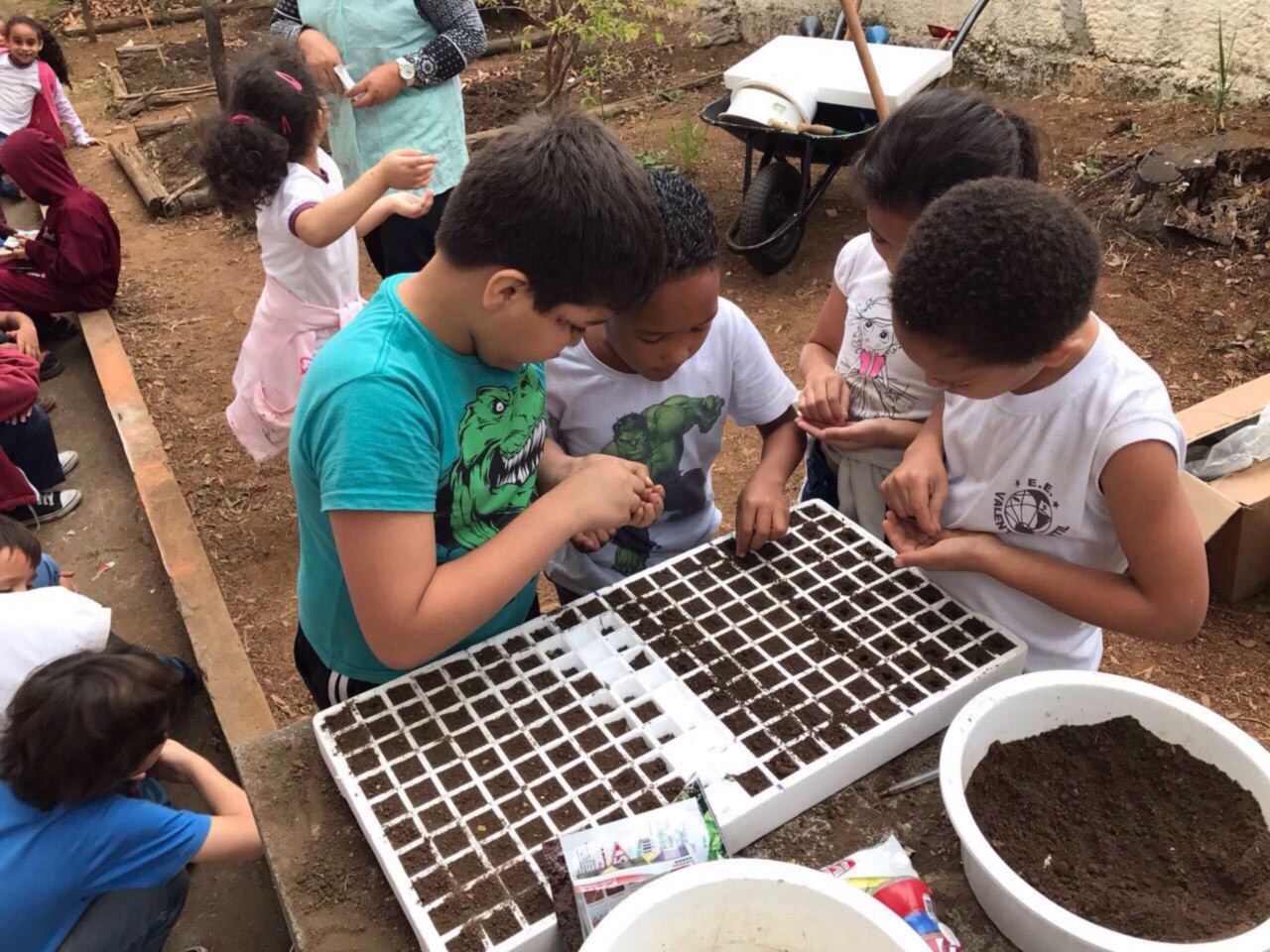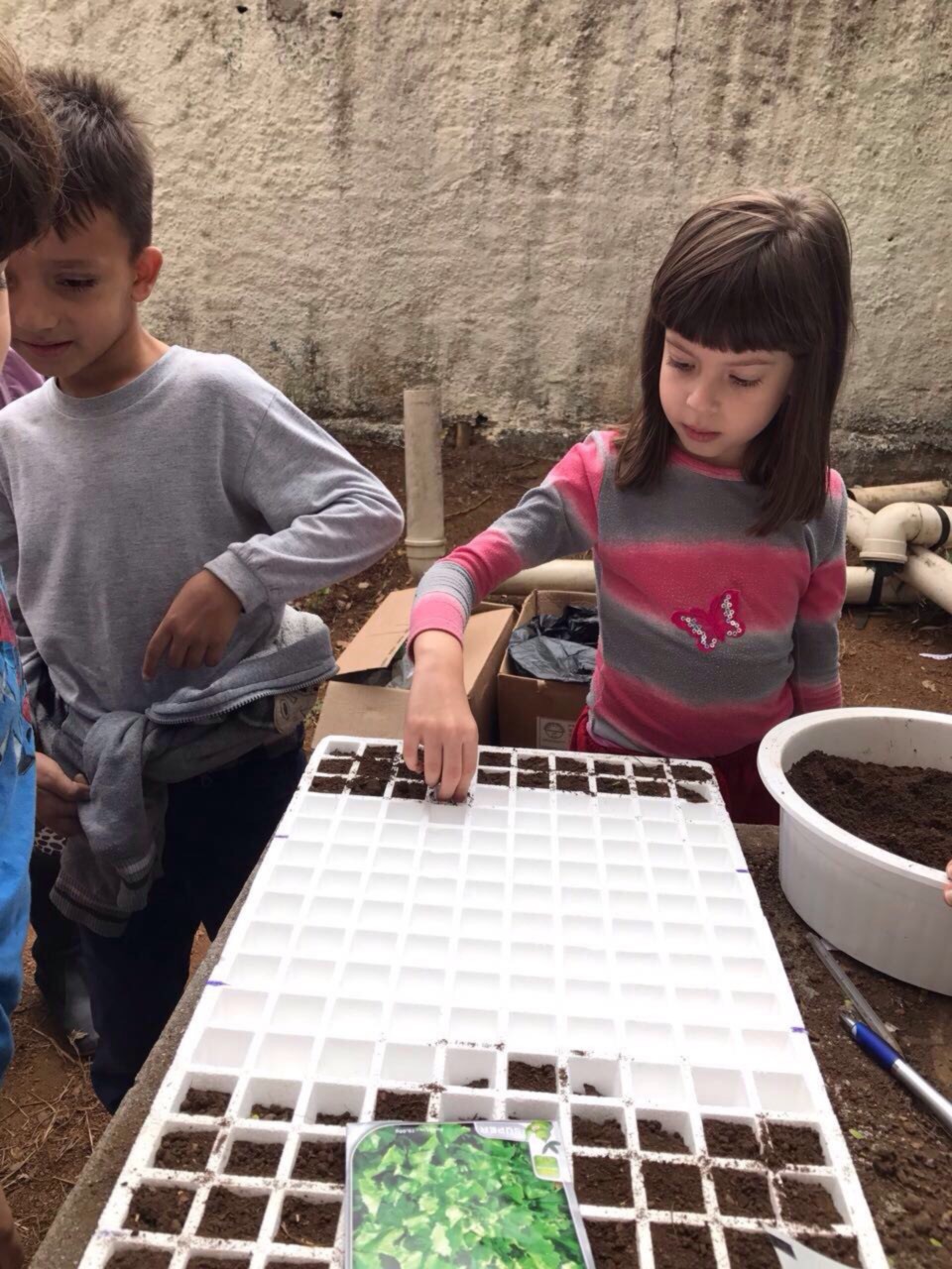 As crianças, junto com os professores, estão revitalizando a horta na escola. Cada sala tem um espaço. Já tem composteira e todas as salas tem sementeira e preparam sua prórpria terra para depois plantar.
