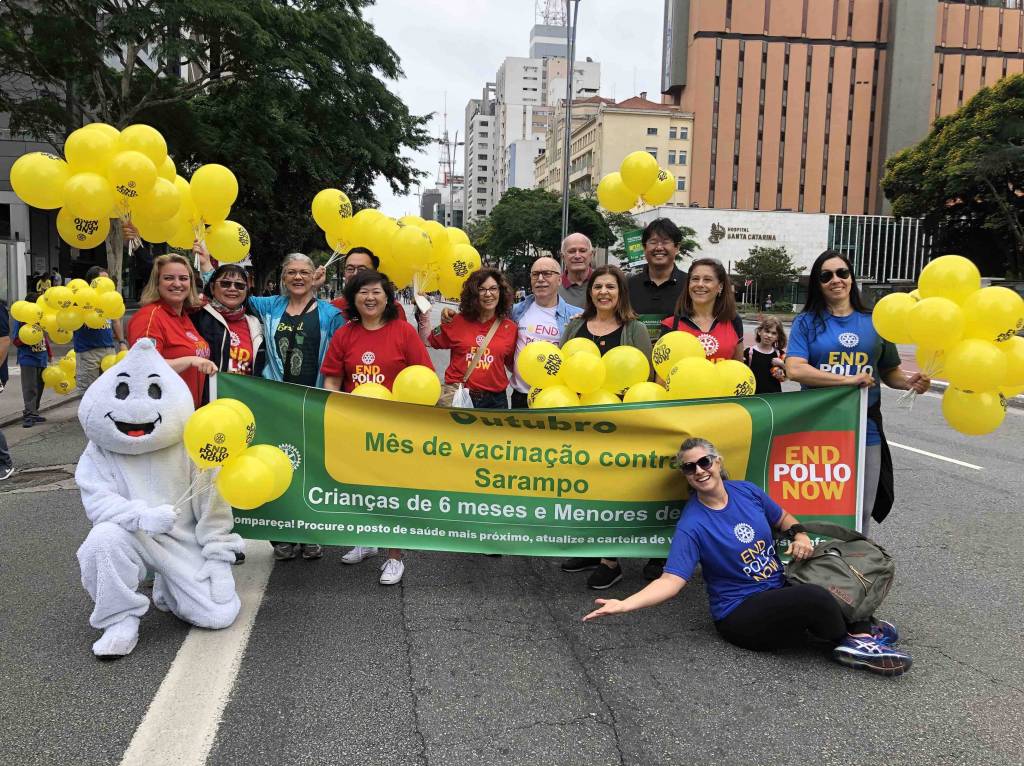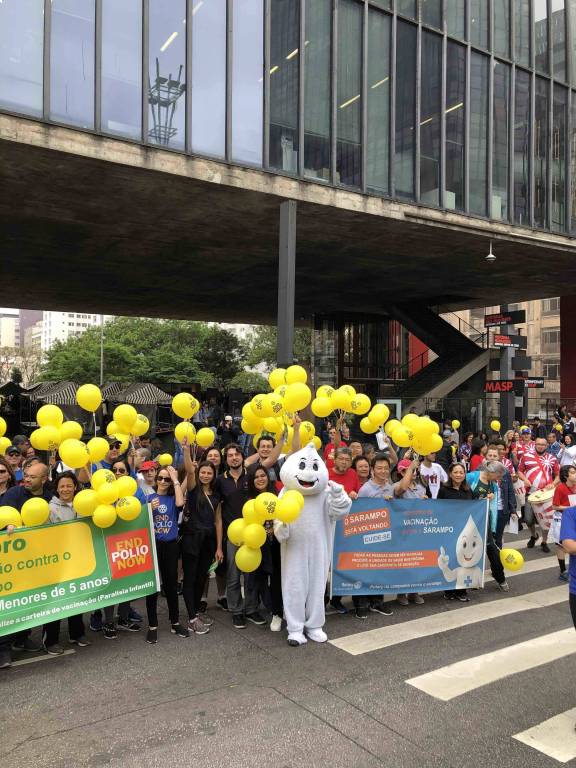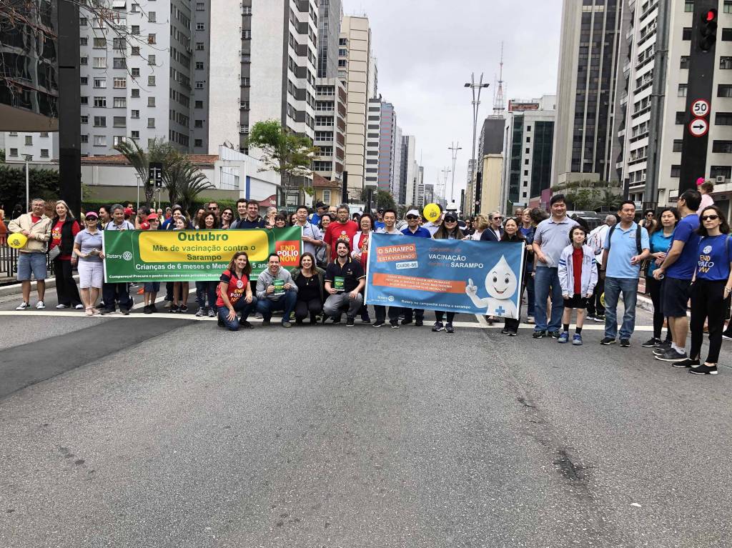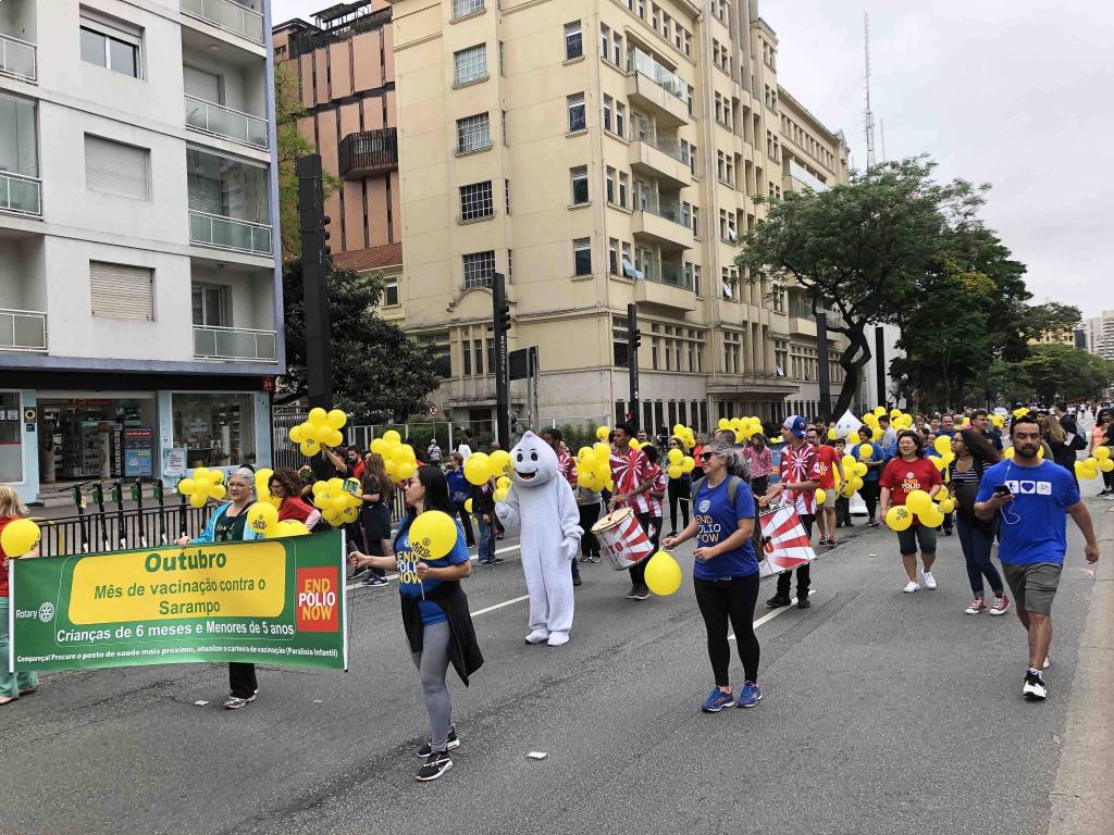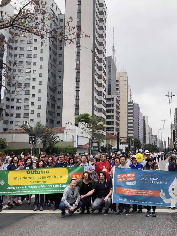 A caminhada em prol da vacinação contra o sarampo e a poliomielite foi realizada com sucesso no dia 20 de outubro de 2019. Na avenida Paulista foi possível reunir clubes de diversas áreas de SP, tanto para encher balões, desfrutar de um bom companheirismo, fortalecer a possibilidade de novas parcerias, integrar companheiros recém-chegados a instituição além de, embalado ao som da bateria da escola de samba fazer uma ação direta com a população, distribuindo panfletos e balões com a nossa marca. Foi uma manhã divertida, animada e de muitos rotarianos em ação, juntos combatendo a poliomielite e o sarampo! Os clubes participantes foram: área SP1 - RCSP Novas Gerações / RCSP Nove de Julho / RCSP Parque do Ibirapuera / RCSP Sudeste / Rotary Satélite SP Sudeste Confraria de Negocios e RCSP Sul | área SP2 - RCSP Centenário / RCSP Ponte Estaiada / RCSP Santo Amaro / RCSP Borba Gato | área SP3 - RCSP Anchieta / RCSP Independência / RCSP Paulistano / RCSP Ipiranga / RCSP Vila Mariana | área SP4 - RCSP Cidade Dutra / RCSP Manacas da Serra / RCSP Parelheiros / RCSP Interlagos | área SP5 - RCSP Aeroporto / RCSP Brasil Taiwan / RCSP Paraíso / RCSP Saúde / R Satélite SP Saúde Brasil Japão. | D. 4563: RCSP Av Paulista / RCSP Barra Funda / RCSP Cantareira / Gov. do distrito Mª Lucia e companheiros de seu clube, RCSP Norte / RCSP Oeste / RCSP São Miguel Paulista / RCSP Caxingui. Jovens intercambistas / Jovens do Interact / Jovens do Rotaract e associados do Rotary Kids. A imagem pública foi divulgada através de faixas, panfleto com orientações sobre a importância da vacinação, balões para alegrar e chamar atenção das crianças, e som da bateria da escola de samba que foi animando e convidando as pessoas para se unirem a nossa caminhada. A todos os responsáveis, GA’s, presidentes, associados e amigos que participaram, fica aqui a certeza de que a união é possível e só traz melhores resultados. Valeu a presença de todos e que possamos repetir mais e mais anos conscientizando e divulgando.